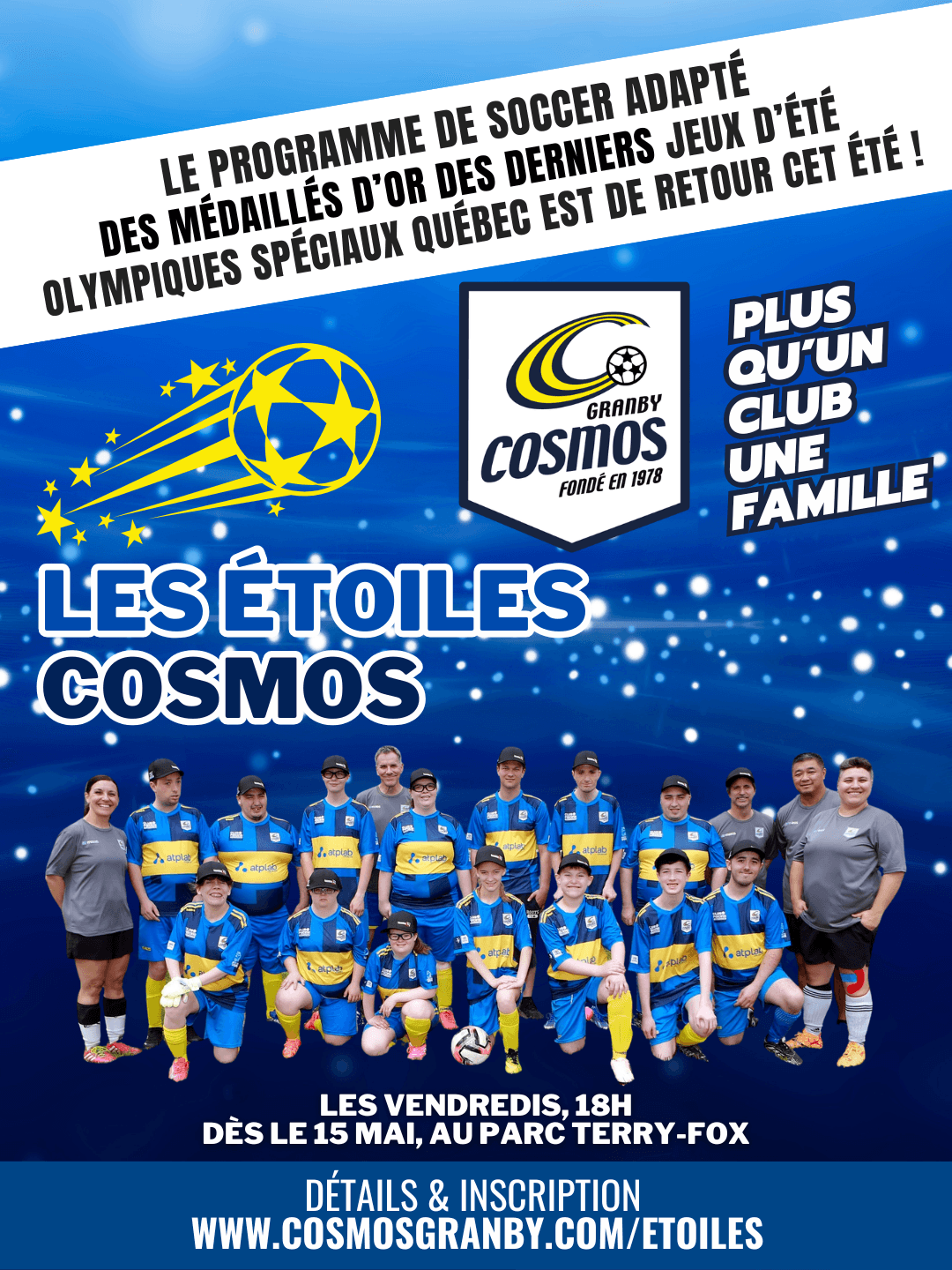 Le Club de soccer Les Cosmos de Granby est fier d’annoncer le retour de son programme Les Étoiles Cosmos, cet été. Ce programme de soccer adapté s’adresse aux personnes ayant un trouble du spectre de l’autisme, une déficience intellectuelle ou un trouble moteur. Et bonne nouvelle, les séances seront encore une fois dirigées par la même équipe d’intervenants formés et passionnés de soccer!